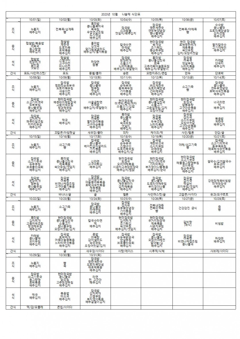 23년 10월식단표 ♥ 페이지 정보 작성자 나솔채 댓글 0건 조회 314회 작성일 23-11-06 13:21 목록 본문 23년 10월식단표 입니다 댓글 0 댓글목록 등록된 댓글이 없습니다.