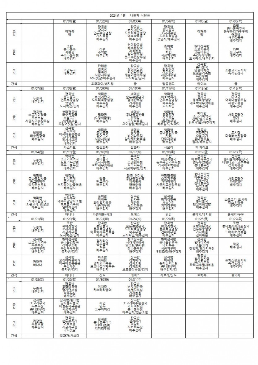 2024년 1월 식단표 페이지 정보 작성자 나솔채 댓글 0건 조회 283회 작성일 24-02-05 10:26 목록 본문 2024년 1월 식단표입니다 댓글 0 댓글목록 등록된 댓글이 없습니다.