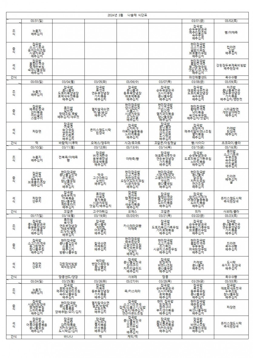 2024년 3월 식단표 페이지 정보 작성자 나솔채 댓글 0건 조회 276회 작성일 24-03-30 15:17 목록 본문 2024년 3월 식단표 댓글 0 댓글목록 등록된 댓글이 없습니다.