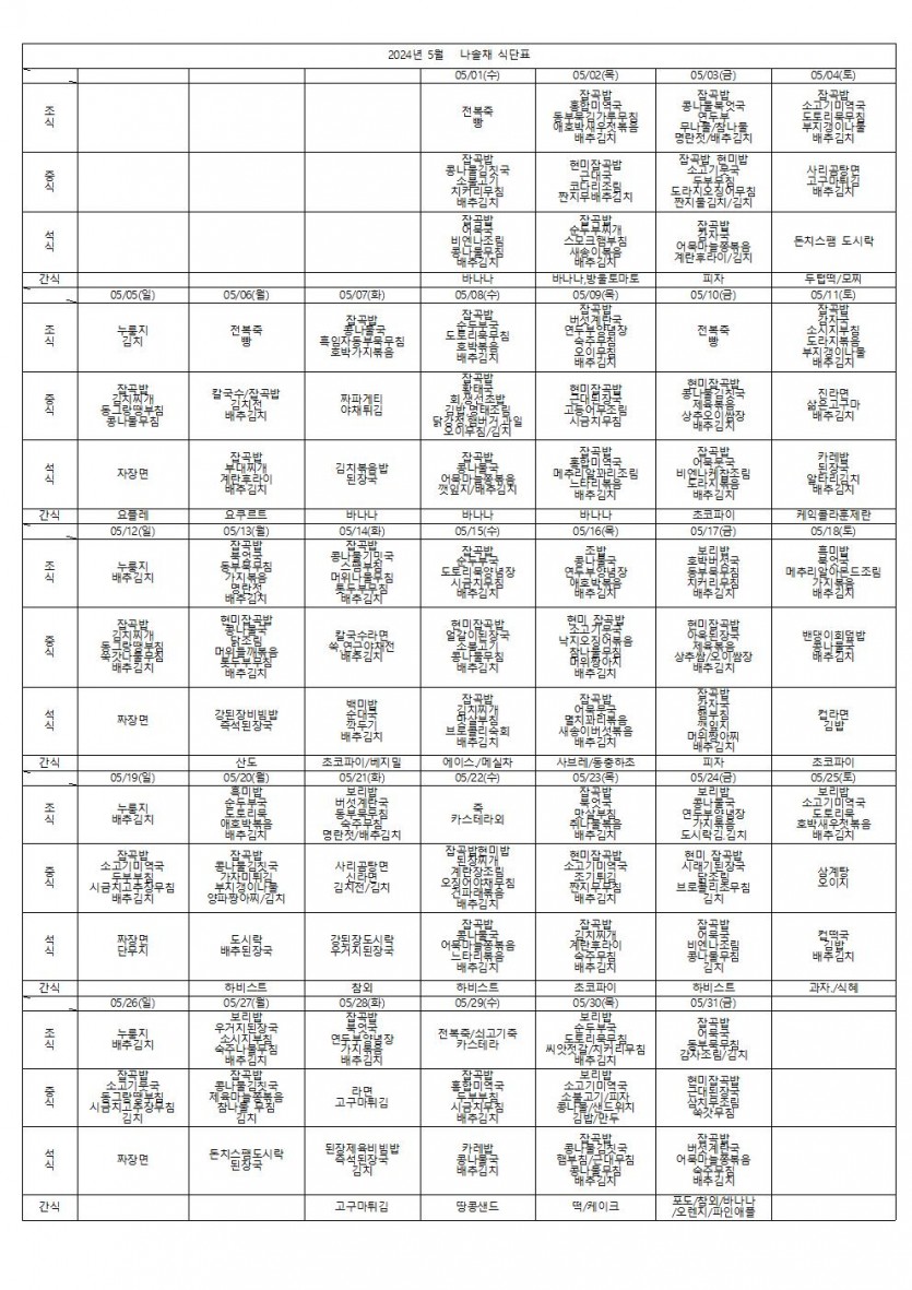 2024년 5월 식단표 페이지 정보 작성자 나솔채 댓글 0건 조회 283회 작성일 24-06-04 16:37 목록 본문 2024년 5월 식단표 입니다 댓글 0 댓글목록 등록된 댓글이 없습니다.