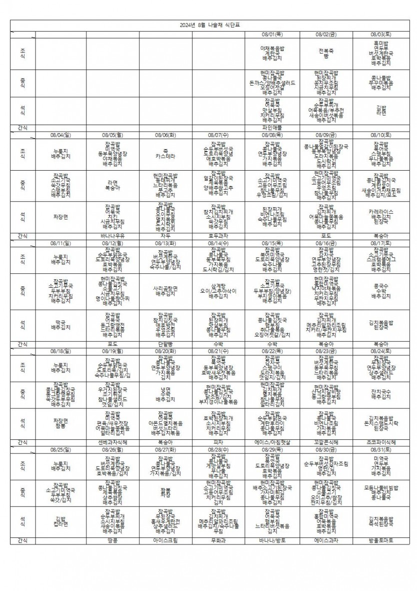 2024년 8월 식단표 페이지 정보 작성자 나솔채 댓글 0건 조회 222회 작성일 24-08-31 14:54 목록 본문 2024년 8월 식단표 댓글 0 댓글목록 등록된 댓글이 없습니다.