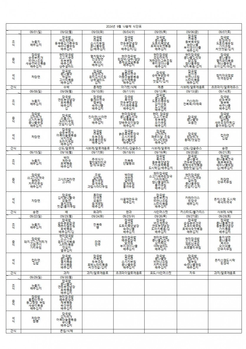 2024년 9월 식단표 페이지 정보 작성자 나솔채 댓글 0건 조회 199회 작성일 24-09-28 13:38 목록 본문 2024년 9월 식단표 댓글 0 댓글목록 등록된 댓글이 없습니다.