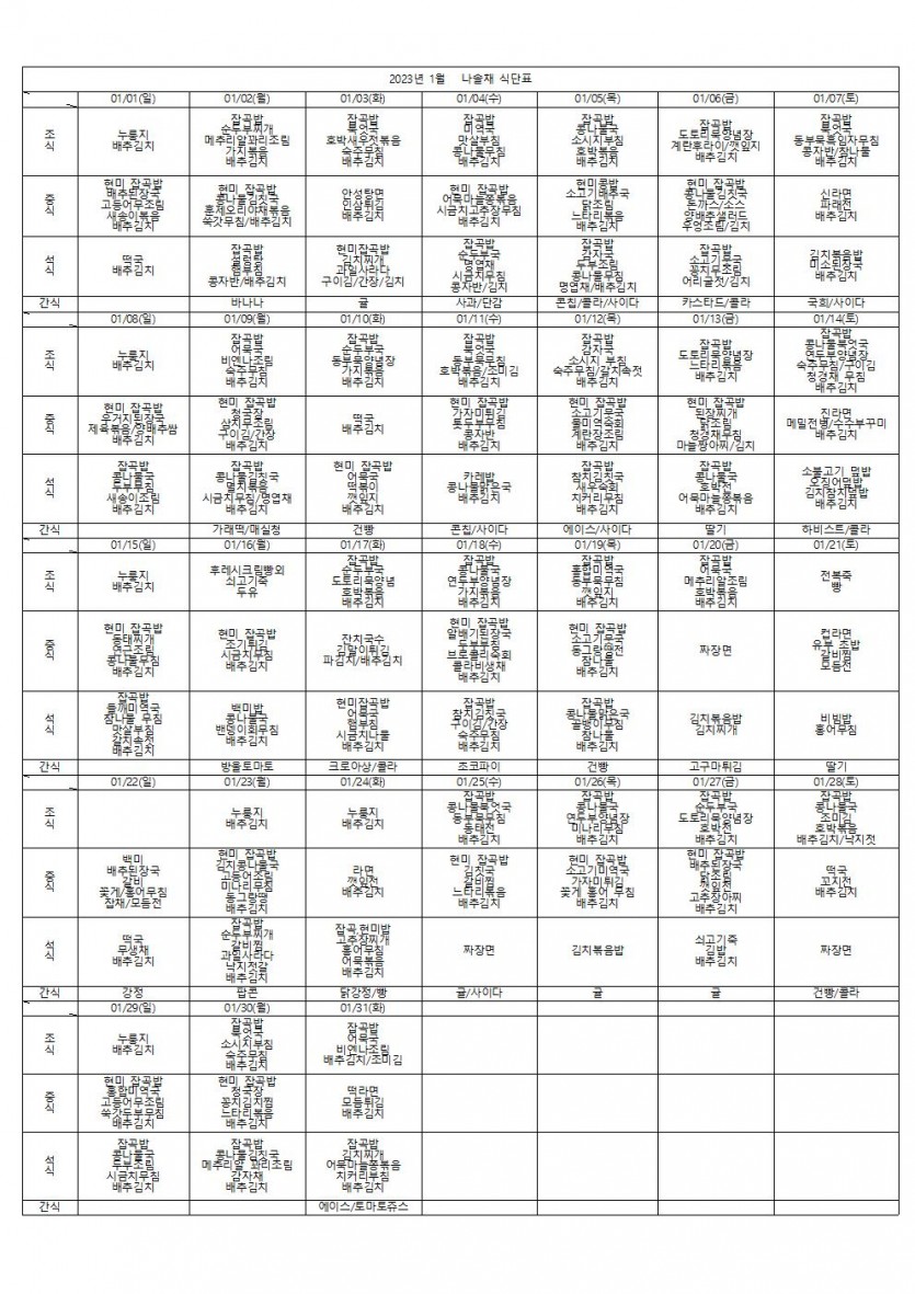 2023년 1월 식단표 페이지 정보 작성자 나솔채 댓글 0건 조회 394회 작성일 23-02-01 16:33 목록 본문 2023년 1월 식단표 입니다 댓글 0 댓글목록 등록된 댓글이 없습니다.