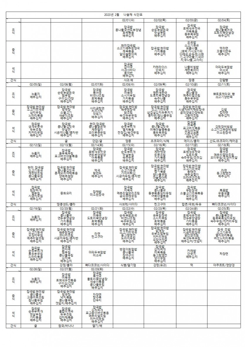 2023년 2월 식단표 페이지 정보 작성자 나솔채 댓글 0건 조회 366회 작성일 23-03-03 10:10 목록 본문 2023년 2월 식단표입니다 댓글 0 댓글목록 등록된 댓글이 없습니다.