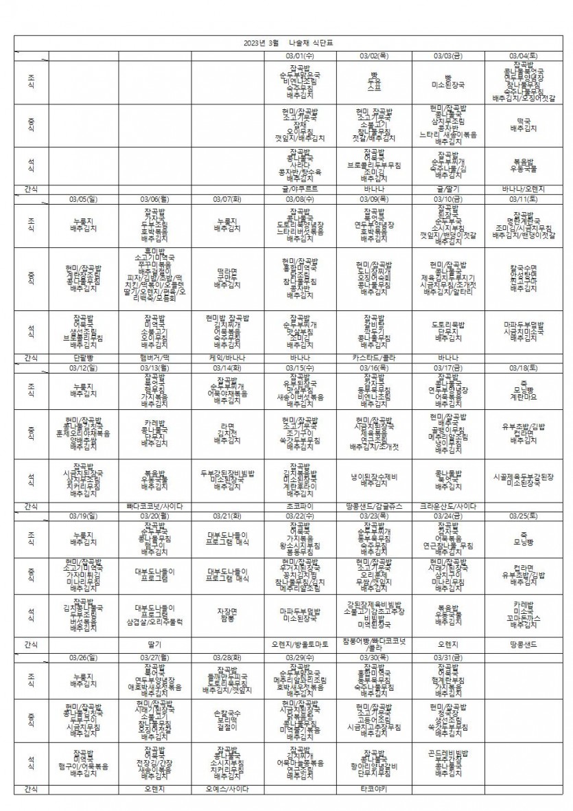 2023년 3월 식단표 페이지 정보 작성자 나솔채 댓글 0건 조회 381회 작성일 23-03-31 11:55 목록 본문 2023년 3월 식단표입니다 댓글 0 댓글목록 등록된 댓글이 없습니다.