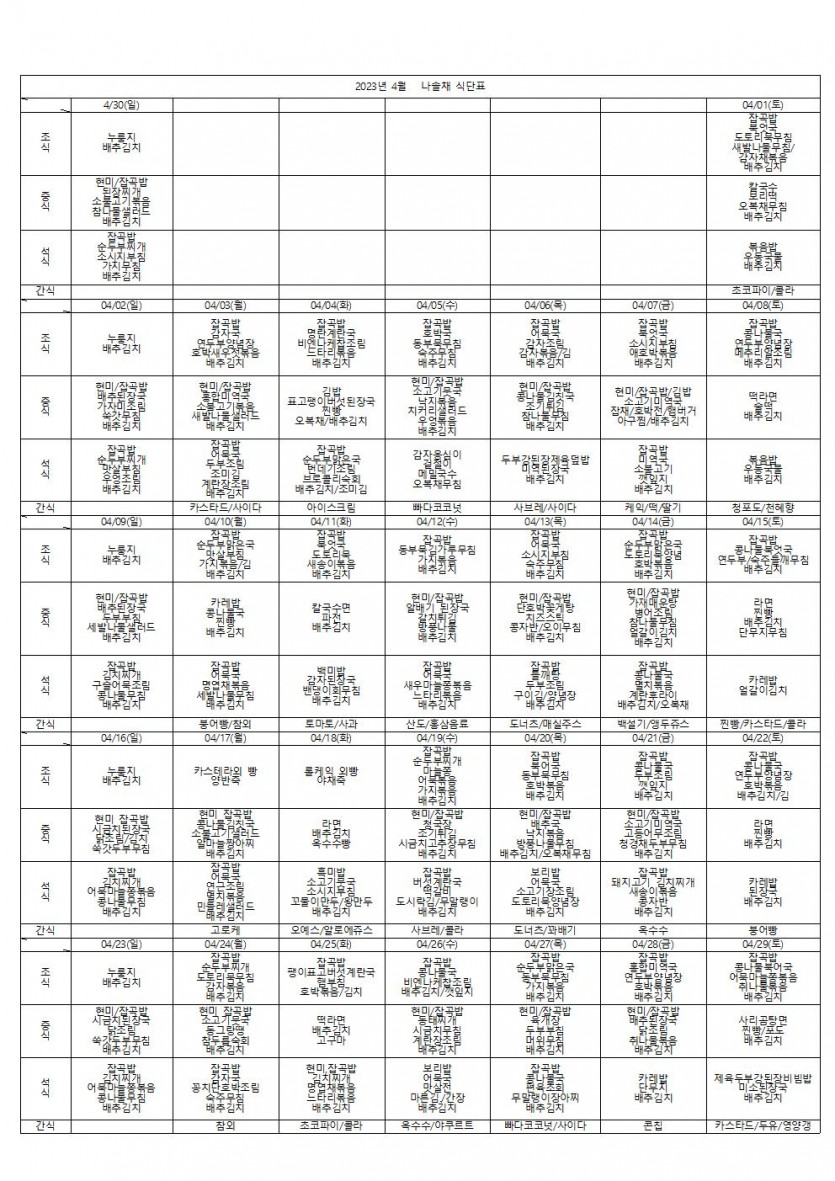 2023년 4월 식단표 페이지 정보 작성자 나솔채 댓글 0건 조회 361회 작성일 23-04-29 10:35 목록 본문 2023년 4월 식단표 댓글 0 댓글목록 등록된 댓글이 없습니다.