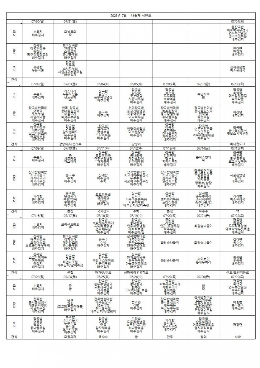 2023년 7월 식단표 페이지 정보 작성자 나솔채 댓글 0건 조회 357회 작성일 23-07-31 09:51 목록 본문 2023년 7월 식단표 댓글 0 댓글목록 등록된 댓글이 없습니다.
