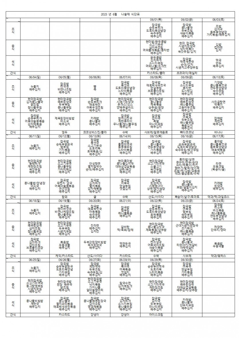 23년 6월식단표 ♥ 페이지 정보 작성자 나솔채 댓글 0건 조회 282회 작성일 23-11-06 13:19 목록 본문 23년 6월식단표입니다 ♥ 댓글 0 댓글목록 등록된 댓글이 없습니다.