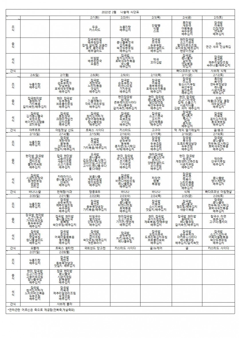 2022년 2월 나솔채 식단표 페이지 정보 작성자 나솔채 댓글 0건 조회 416회 작성일 22-05-12 09:26 목록 본문 2022년 2월 나솔채 식단표 댓글 0 댓글목록 등록된 댓글이 없습니다.