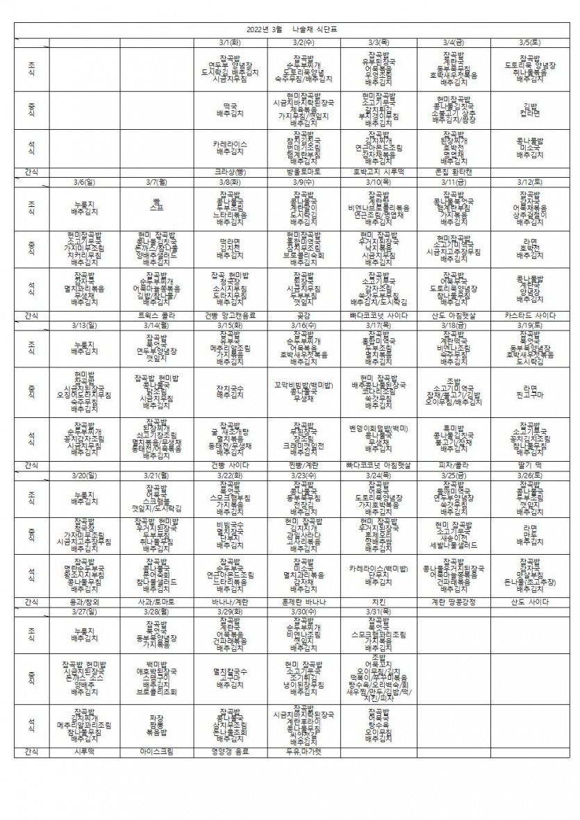 2022년 3월 나솔채 식단표 페이지 정보 작성자 나솔채 댓글 0건 조회 464회 작성일 22-05-12 09:26 목록 본문 2022년 3월 나솔채 식단표 댓글 0 댓글목록 등록된 댓글이 없습니다.