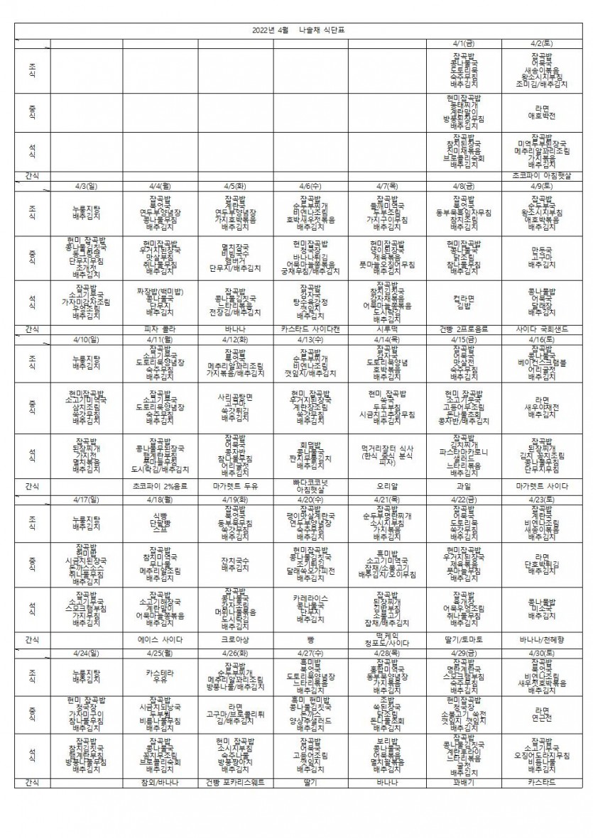 2022년 4월 나솔채 식단표 페이지 정보 작성자 나솔채 댓글 0건 조회 456회 작성일 22-05-12 09:27 목록 본문 2022년 4월 나솔채 식단표 댓글 0 댓글목록 등록된 댓글이 없습니다.