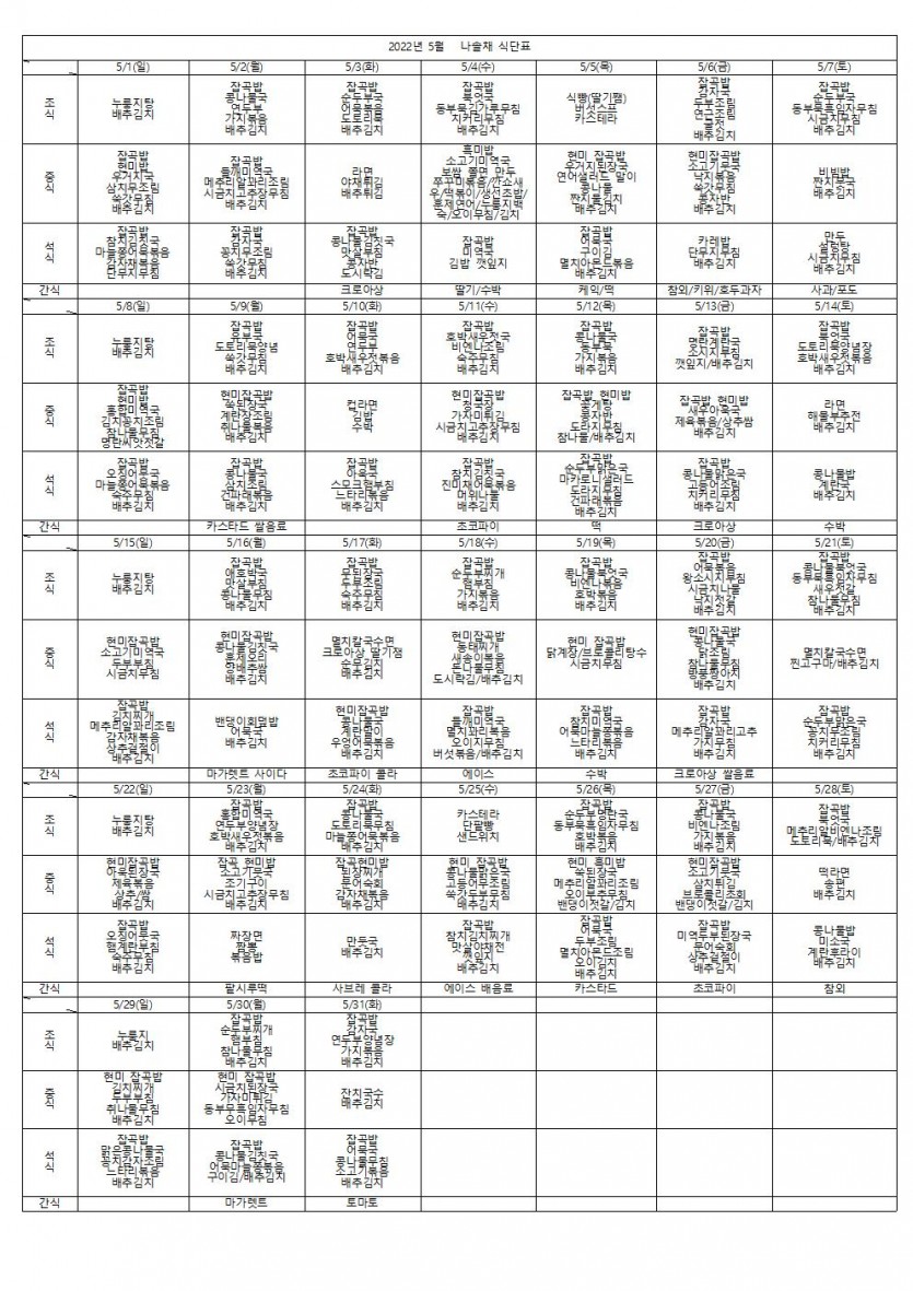 2022년 5월 나솔채 식단표 페이지 정보 작성자 나솔채 댓글 0건 조회 428회 작성일 22-05-31 11:50 목록 본문 2022년 5월 나솔채 식단표 입니다 댓글 0 댓글목록 등록된 댓글이 없습니다.