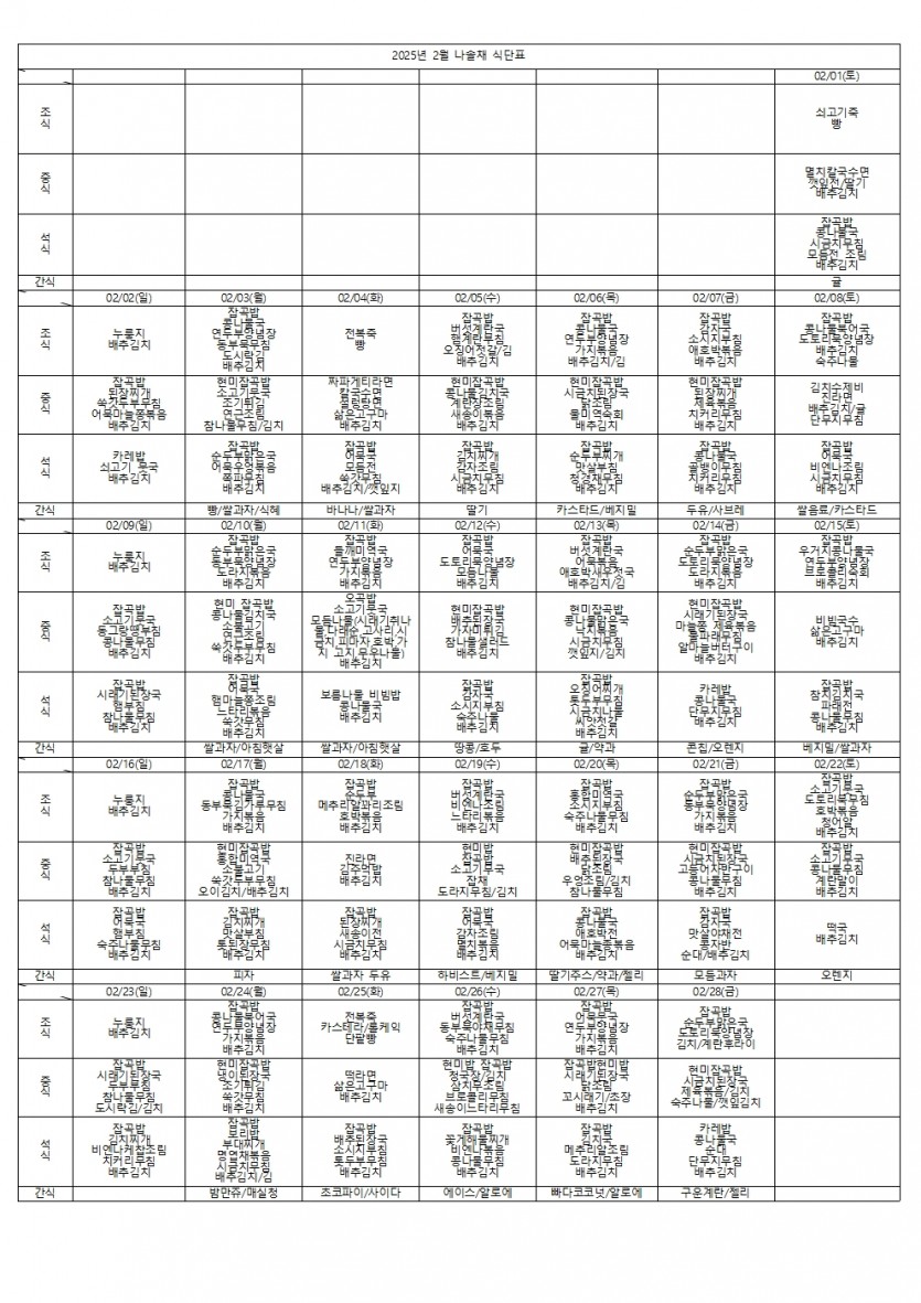 2025년 2월 식단표 페이지 정보 작성자 나솔채 댓글 0건 조회 109회 작성일 25-03-08 17:38 목록 본문 2025년 2월 식단표 댓글 0 댓글목록 등록된 댓글이 없습니다.