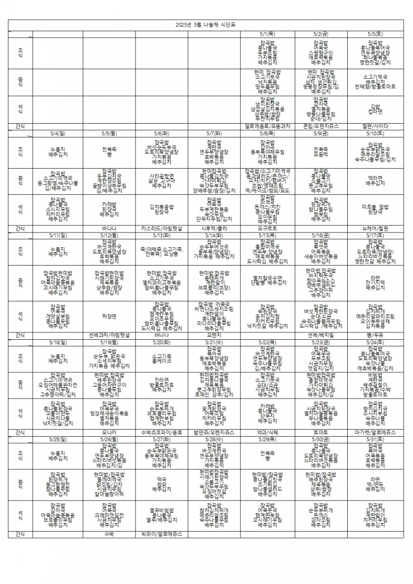 2025년 5월 식단표 페이지 정보 작성자 나솔채 댓글 0건 조회 95회 작성일 25-05-28 15:38 목록 본문 2025년 5월 식단표 댓글 0 댓글목록 등록된 댓글이 없습니다.