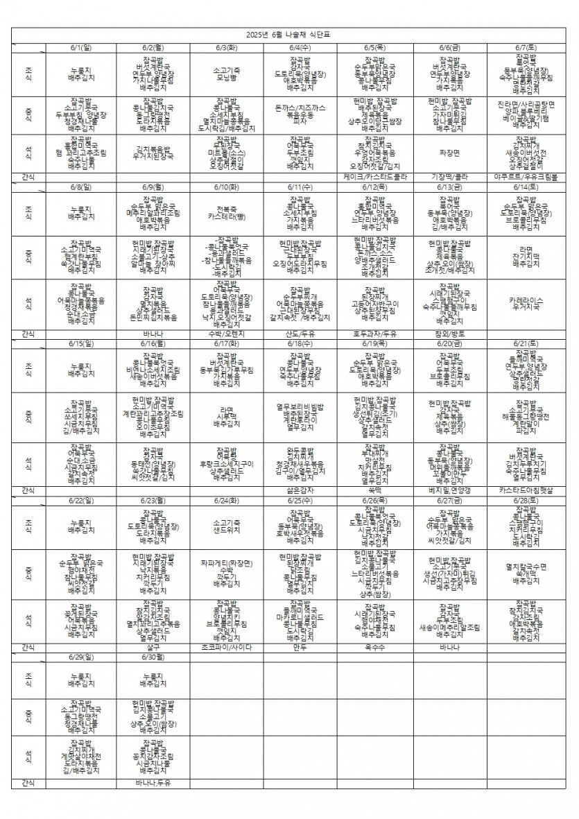 2025년 6월 식단표 페이지 정보 작성자 나솔채 댓글 0건 조회 91회 작성일 25-07-03 15:30 목록 본문 2025년 6월 식단표 댓글 0 댓글목록 등록된 댓글이 없습니다.