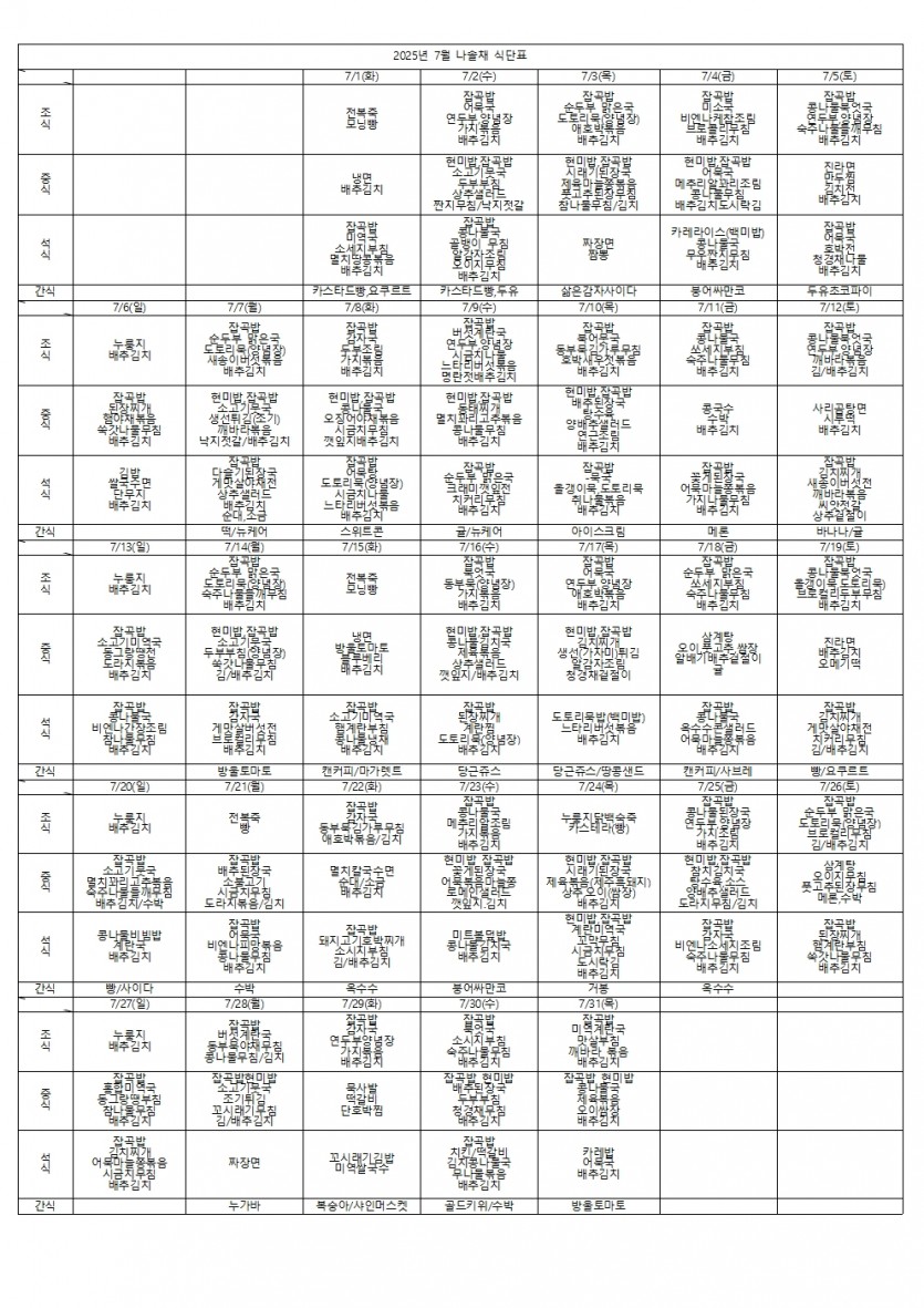 2025년 7월 식단표 페이지 정보 작성자 나솔채 댓글 0건 조회 78회 작성일 25-07-31 17:39 목록 본문 2025년 7월 식단표 댓글 0 댓글목록 등록된 댓글이 없습니다.
