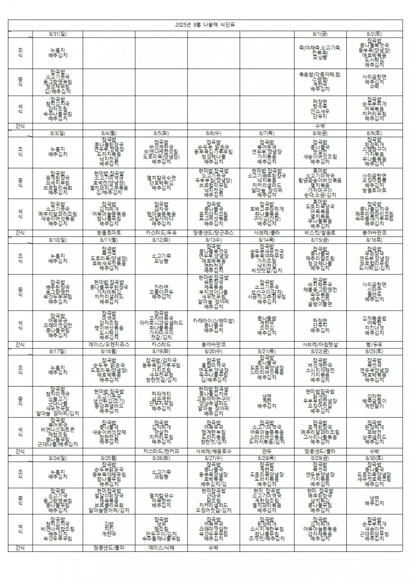 2025년 8월 식단표 페이지 정보 작성자 나솔채 댓글 0건 조회 71회 작성일 25-08-28 11:49 목록 본문 2025년 8월 식단표 댓글 0 댓글목록 등록된 댓글이 없습니다.