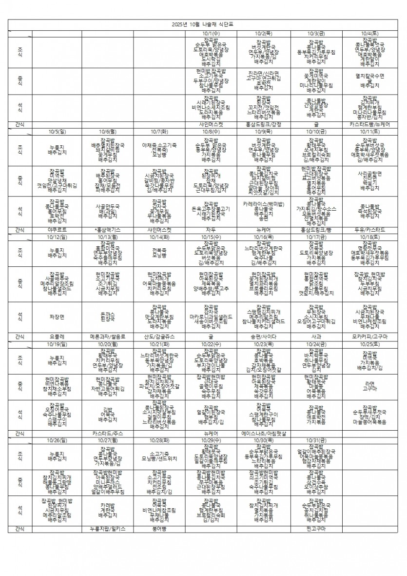 2025년 10월 식단표 페이지 정보 작성자 나솔채 댓글 0건 조회 48회 작성일 25-11-04 09:54 목록 본문 2025년 10월 식단표 댓글 0 댓글목록 등록된 댓글이 없습니다.
