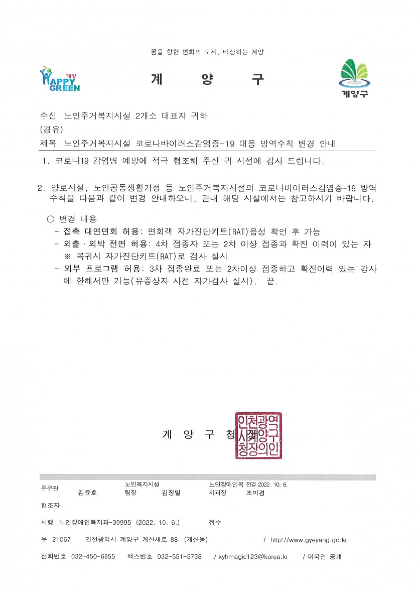 노인주거복지시설 방역수칙 변경 안내 페이지 정보 작성자 나솔채 댓글 0건 조회 1,300회 작성일 22-10-06 17:09 목록 본문 노인주거복지시설 방역수칙 변경 안내 사항을 공지합니다 이전글나솔채 홍현송 원장, 국민훈장 목련장 수상 22.10.12 다음글요양보호사 모집합니다. 22.08.18 댓글 0 댓글목록 등록된 댓글이 없습니다.