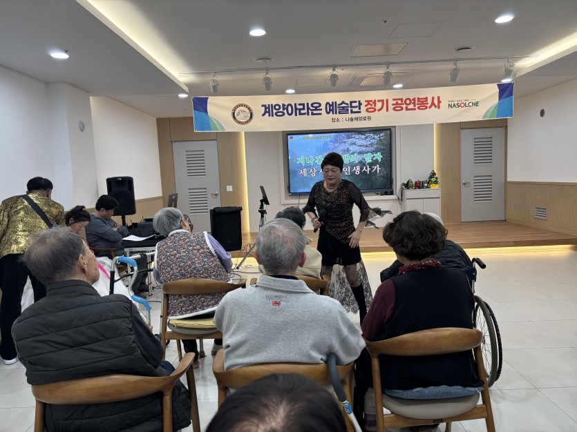 아라온 공연단 공연봉사 페이지 정보 작성자 나솔채 댓글 0건 조회 36회 작성일 26-02-10 17:48 목록 본문 아라온 공연단 공연봉사 이전글어르신 영화 관람 26.02.10 다음글어르신 이미용 서비스 26.02.10 댓글 0 댓글목록 등록된 댓글이 없습니다.